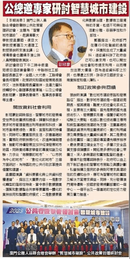 2023年9月24日下午14:30—18:30,澳门公务人员联合总会(公总)举行公共政策管理研讨会,主题为“智慧城市建设”。出席的嘉宾包括中联办社工部姜正宇副部长,全国人大代表、澳门工会联合总会何雪卿会长,政策研究和区域发展局张作文局长,法务局卢瑞祥副局长,澳门生产力暨科技转移中心曾泽瑶副理事长,公总会长彭冠豪、理事长唐伟杰、监事长李华苞等领导,以及澳门大学和澳门理工学院的部分教授和博士研究生。