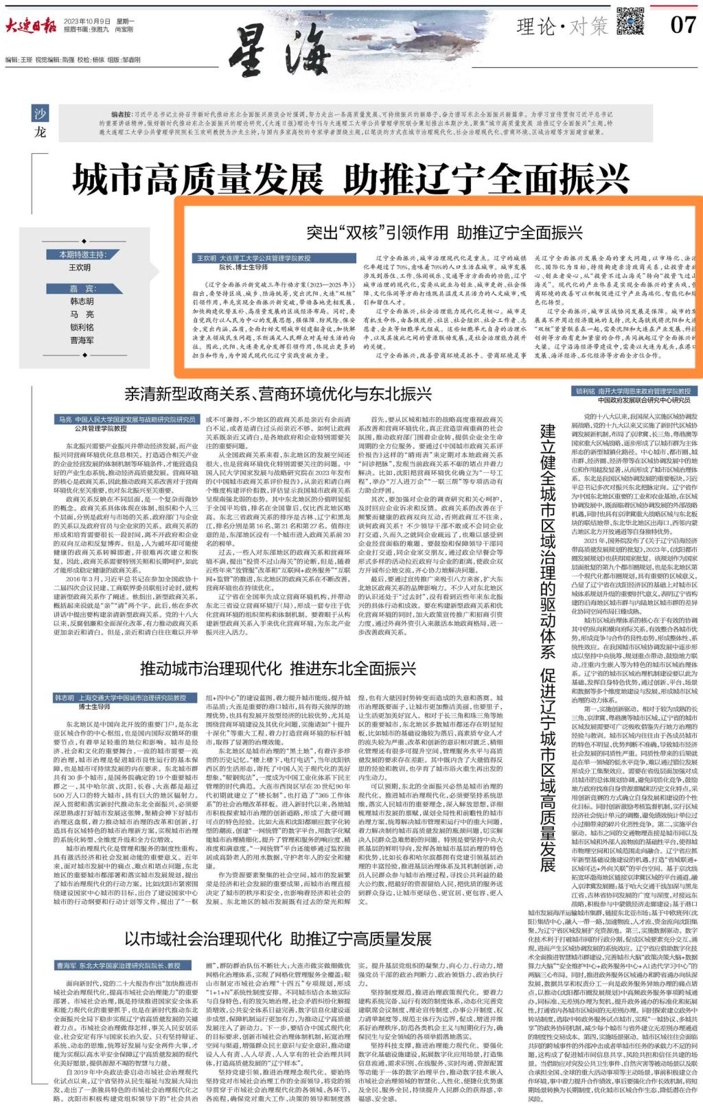 编者按:习近平总书记主持召开新时代推动东北全面振兴座谈会时强调,努力走出一条高质量发展、可持续振兴的新路子,奋力谱写东北全面振兴新篇章。为学习宣传贯彻习近平总书记重要讲话精神,做好新时代推动东北全面振兴的理论研究,《大连日报》理论专刊与大连理工大学公共管理学院联合策划推出本期沙龙,聚焦“城市高质量发展 助推辽宁全面振兴”主题,特邀大连理工大学公共管理学院院长王欢明教授为沙龙主持,与国内多家高校的专家学者围绕主题,以笔谈的方式在城市治理现代化、社会治理现代化、营商环境、区域治理等方面建言献策。