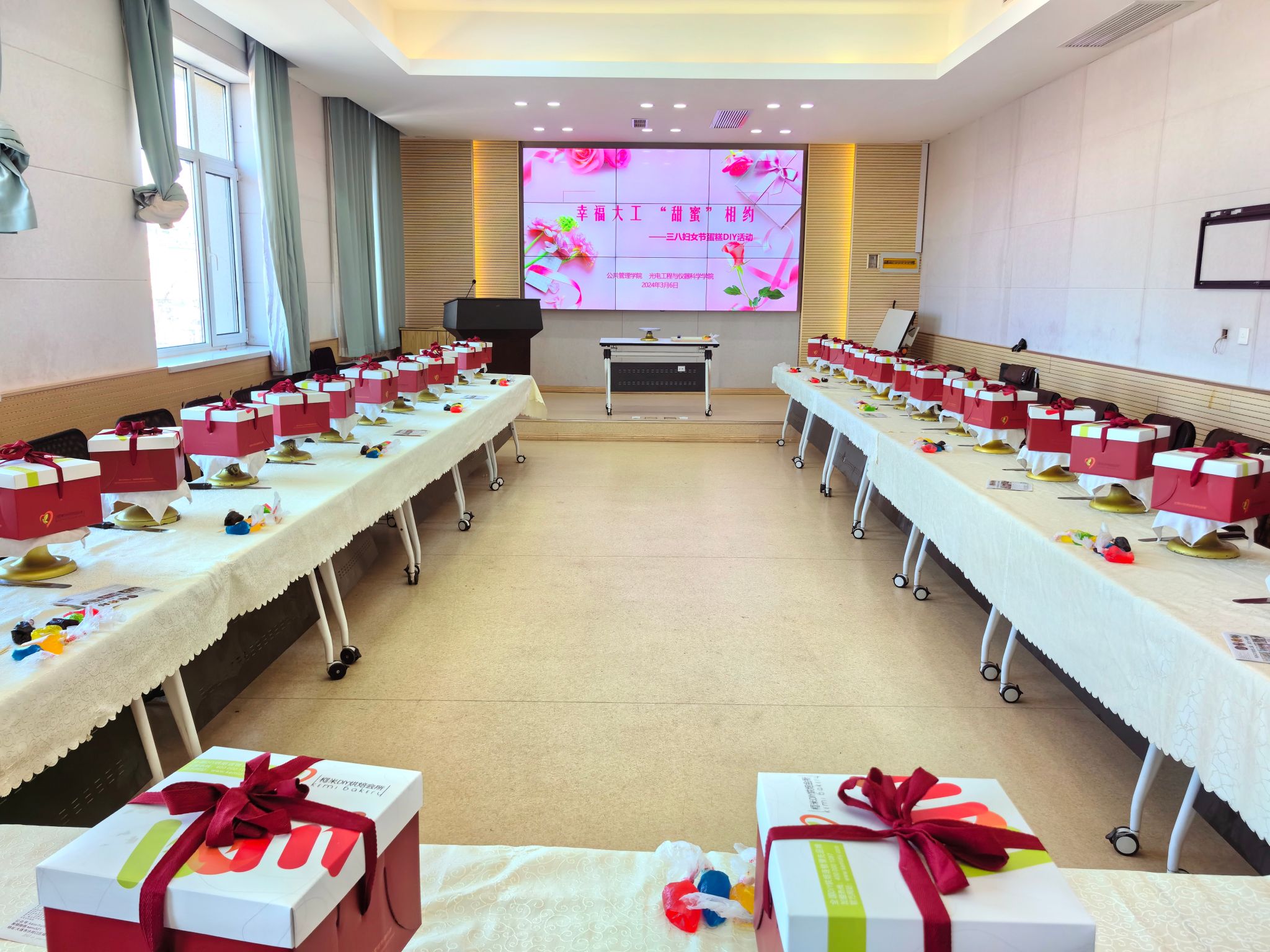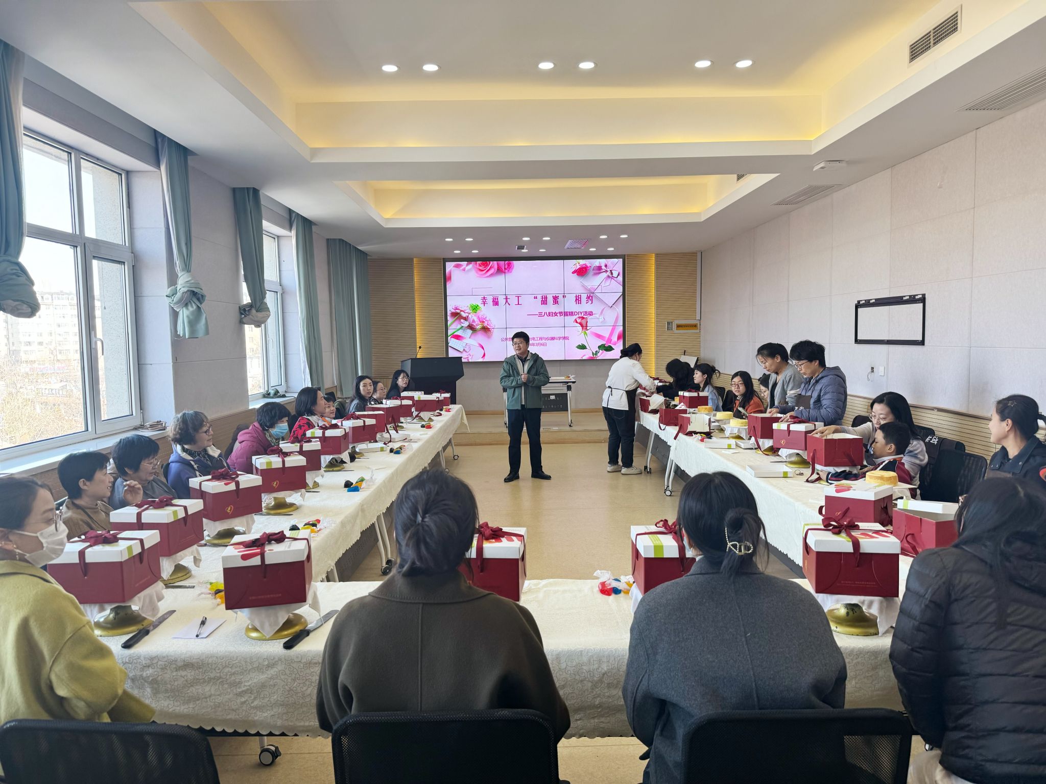 在第114个“三八”国际劳动妇女节到来之际,为营造健康和谐、积极向上的节日氛围,3月6日下午,由公共管理学院、光电工程与仪器科学学院联合举办的三八妇女节蛋糕DIY活动在厚德楼610报告厅举行,活动在光电工程与仪器科学学院党委副书记、副院长兼工会主席金德辉对女职工的节日祝福中拉开序幕,来自全校各单位的三十余名女教工参与活动。