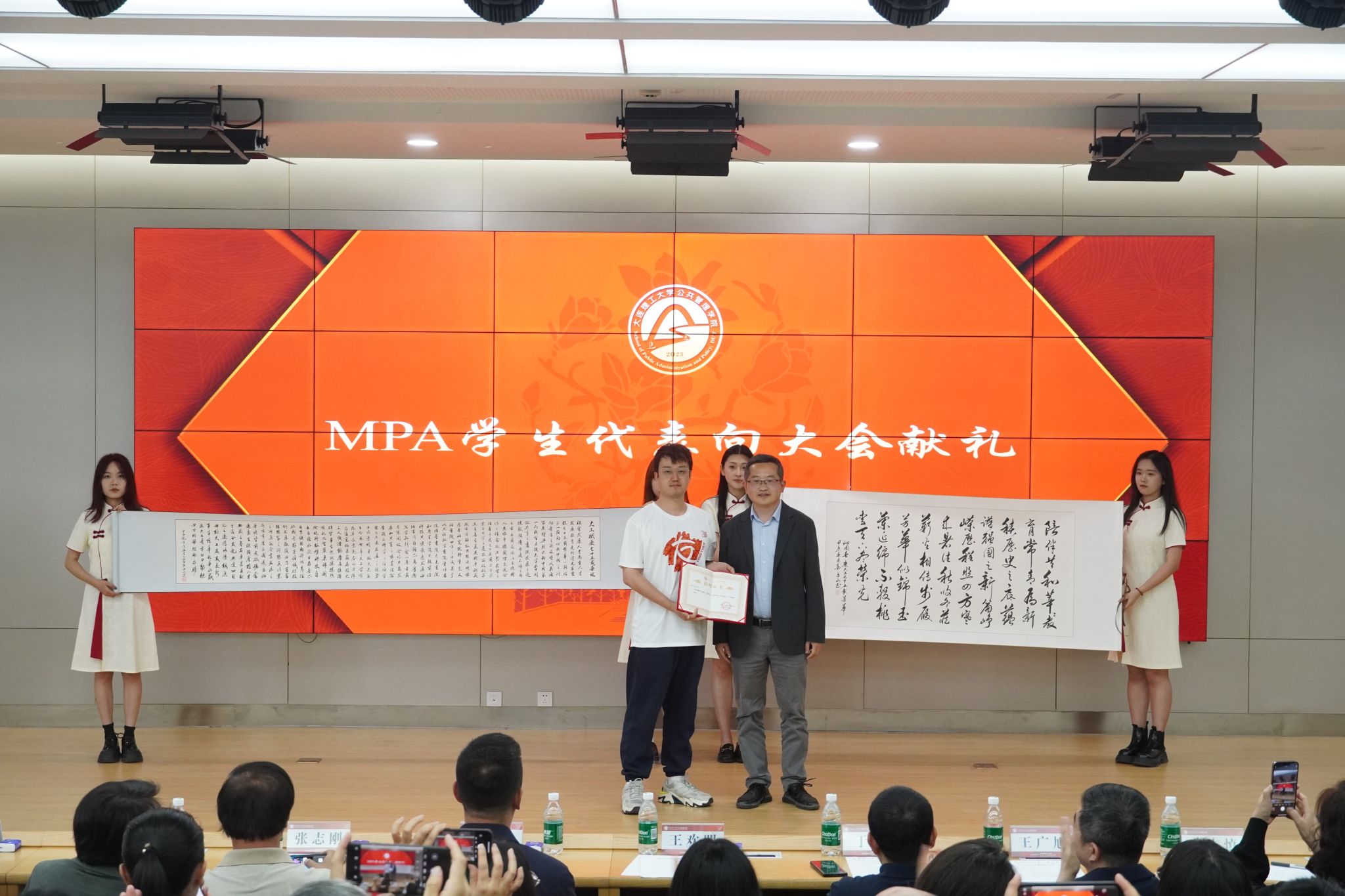 学院MPA在校生代表郭占山向学院捐赠为学院书写的书法作品,表达了对学校的热爱和对未来的憧憬。