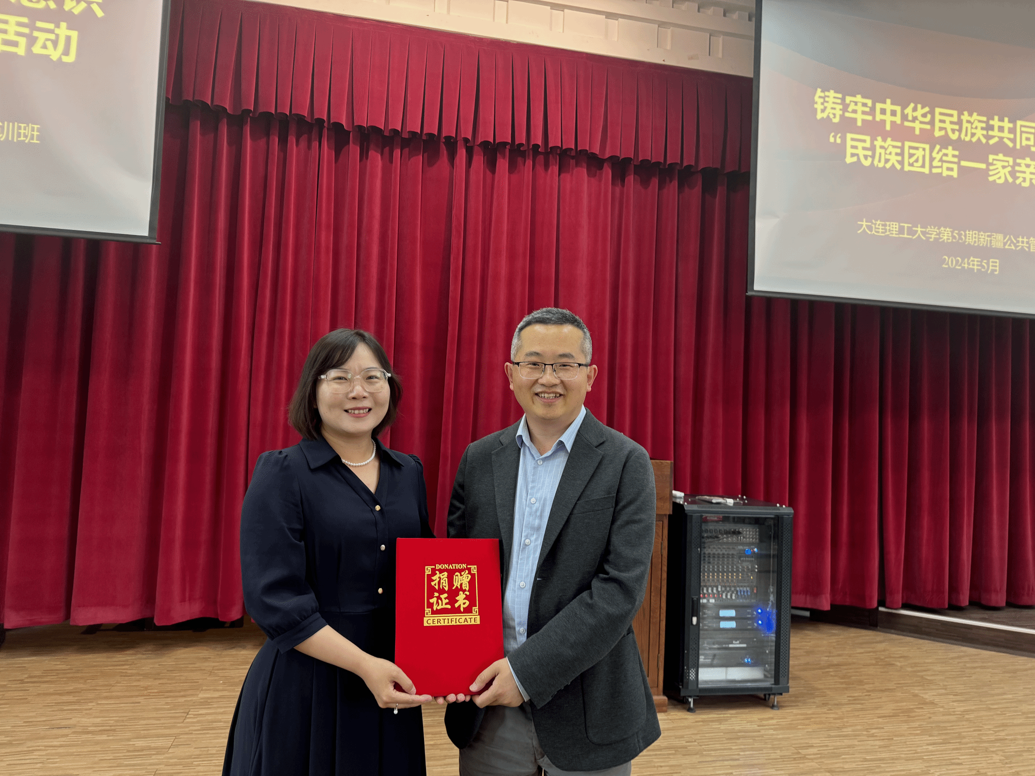 在热烈的掌声中,王欢明院长向新疆班颁发“民族团结一家亲”爱心捐赠证书。