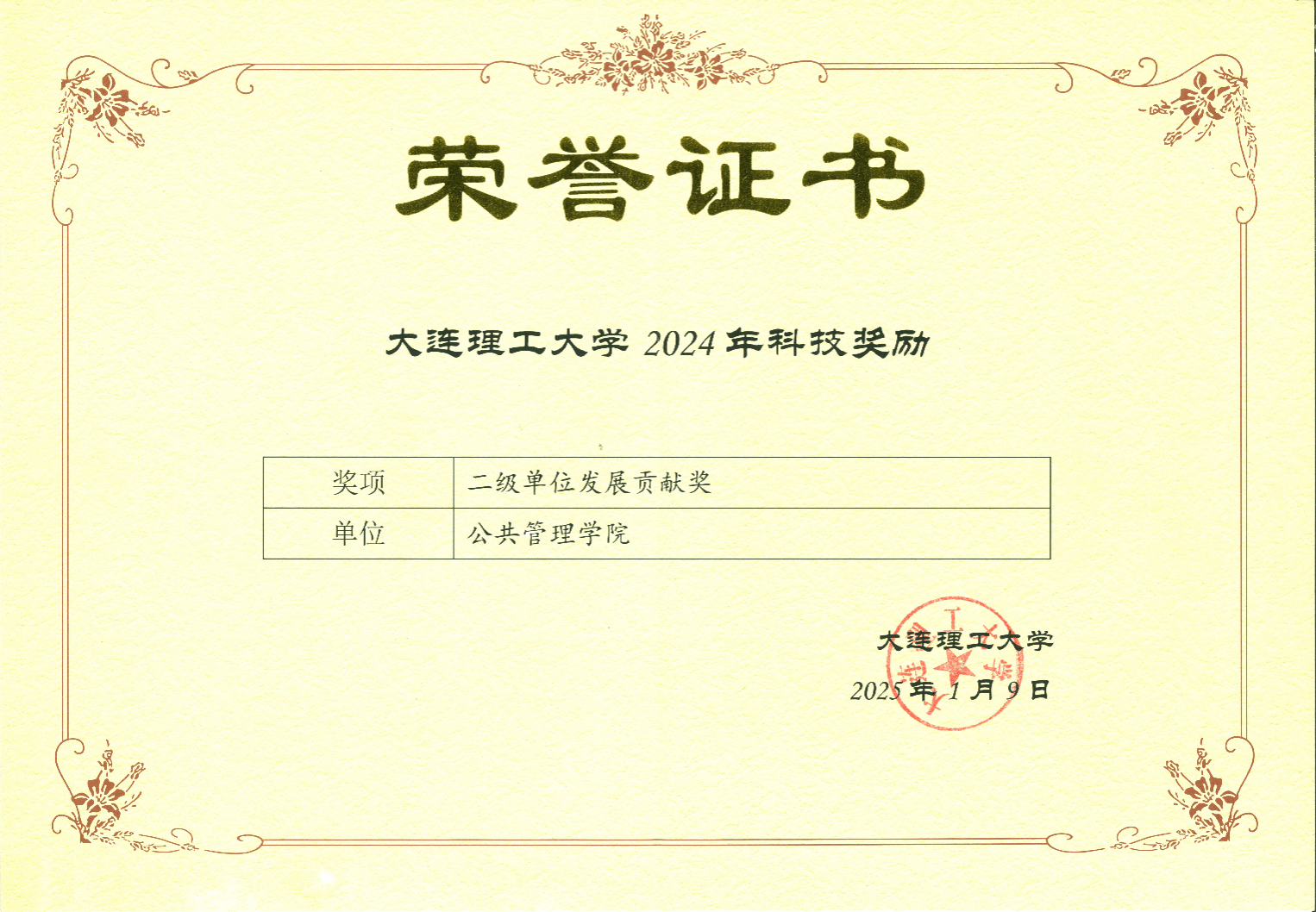 2025年1月9日,学校召开2024年度科技奖励大会。会上,公共管理学院荣获二级单位发展贡献奖,此次学校共有7家单位获此殊荣。