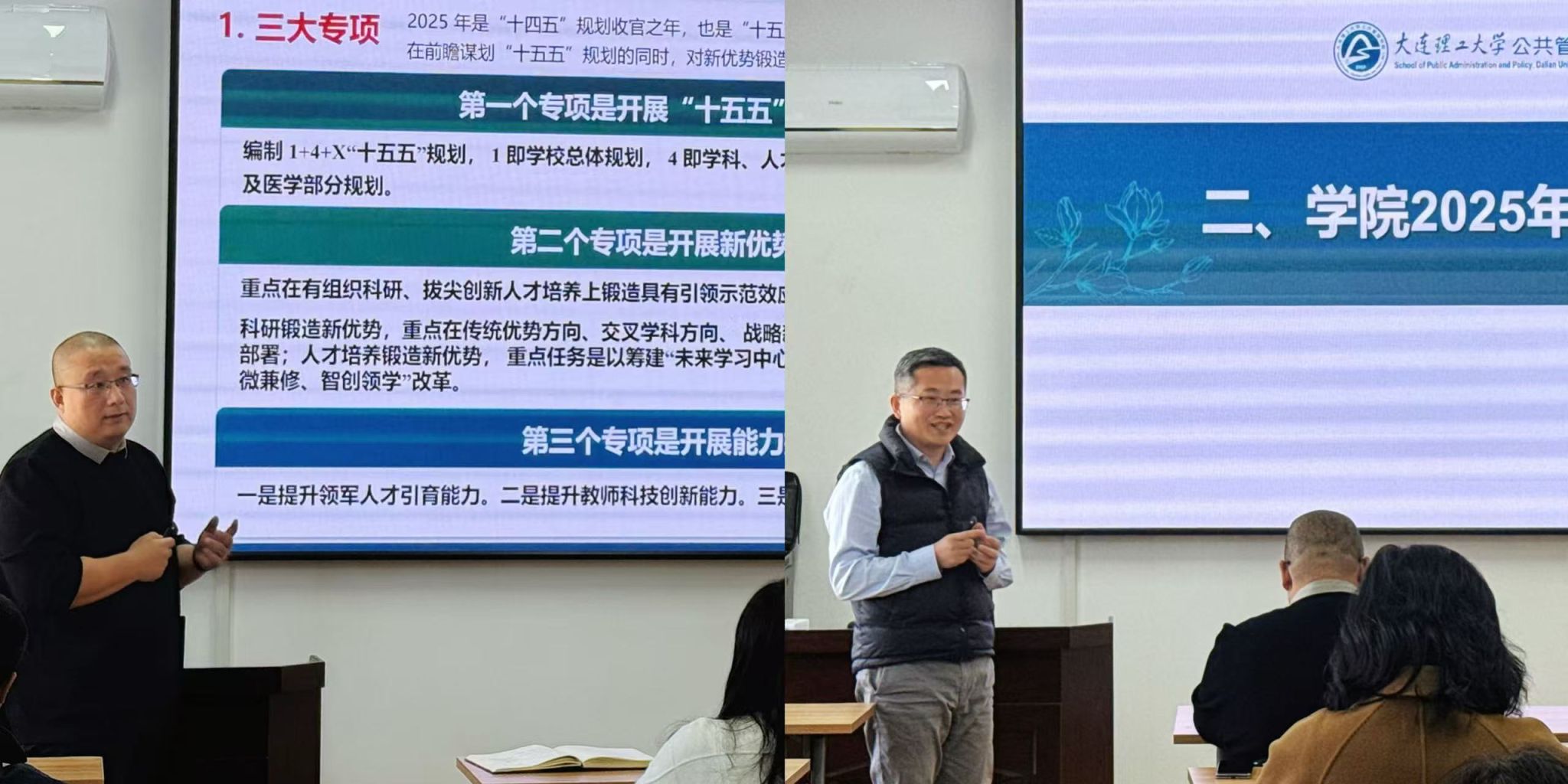 王欢明院长讲解学院工作要点。2025年度,学院将围绕学校的整体部署,从招生工作、人才培养及人才队伍建设、科研工作等多方面发力,精心规划,严密落实,全力推进各项工作向着新优势锻造的目标奋勇前行,凝练属于学院的独特优势,为学校发展和国家建设贡献公管力量!