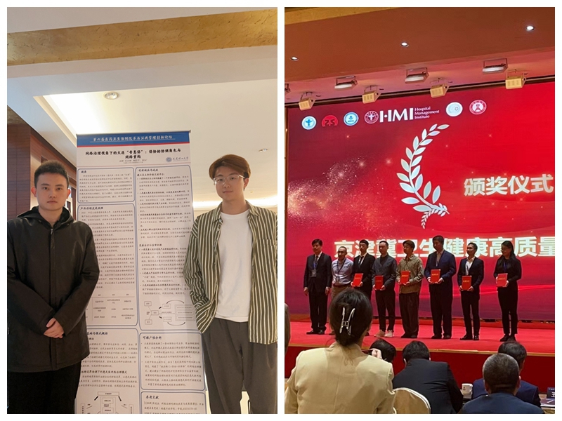 此外,在2023年10月底,在首都卫生管理与政策研究基地主办的第六届“医药卫生体制改革与公共管理创新”论坛中,我院王群老师、张弘老师带队,杨震宇、肖杰雄同学组成的参赛队伍提交了《网络治理视角下的大连“普惠保”:保协的协调角色与网络重构》高质量案例论文一篇,顺利斩获大赛案例三等奖,并获得论坛活动邀请进行海报展示和接受颁奖。