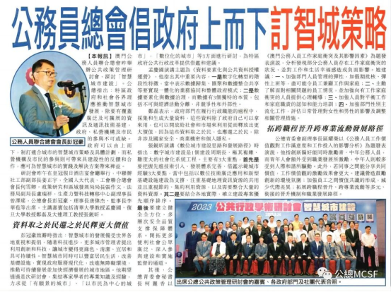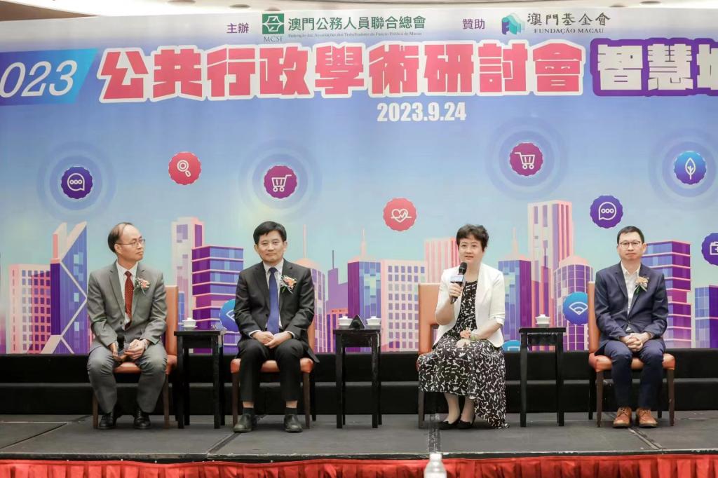 2023年9月24日下午14:30—18:30,澳门公务人员联合总会(公总)举行公共政策管理研讨会,主题为“智慧城市建设”。出席的嘉宾包括中联办社工部姜正宇副部长,全国人大代表、澳门工会联合总会何雪卿会长,政策研究和区域发展局张作文局长,法务局卢瑞祥副局长,澳门生产力暨科技转移中心曾泽瑶副理事长,公总会长彭冠豪、理事长唐伟杰、监事长李华苞等领导,以及澳门大学和澳门理工学院的部分教授和博士研究生。