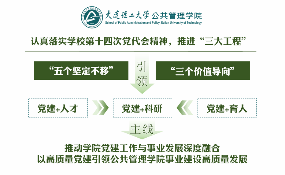 公共管理学院党委坚持以习近平新时代中国特色社会主义思想为指导,认真落实学校第十四次党代会精神,坚持以“五个坚定不移”和“三个价值导向”为引领,以“党建+科研”为主线,拓展各方合作载体,贯通产学研衔接,以“党建+人才”、“党建+育人”为支撑,注重人才强基、深化育人成效,促进党建与学院事业发展深度融合,以高质量党建引领推动学院事业发展,为推进“三大工程”、奋力谱写东北全面振兴新篇章做出更大贡献。