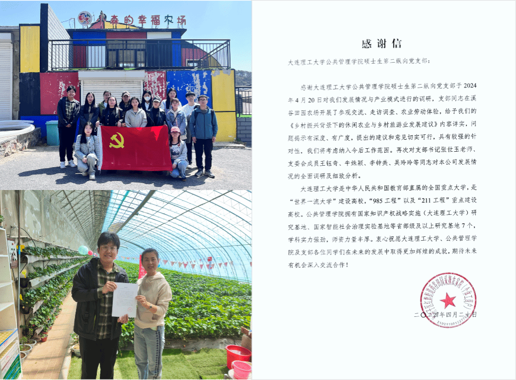甘井子区岔鞍村打造休闲农业生态园,入选2020年辽宁省级休闲农业和乡村旅游特色村名单,在乡村振兴进程中积累了大量宝贵经验。支部组织成员深入溪谷田园农场调研“种植基地+休闲农业”特色产业模式、销售渠道,实地体验农产品采摘、清洗、包装等农场劳动。支部成员充分发挥专业知识,将调研成果整理形成《乡村振兴背景下的休闲农业与乡村旅游业发展建议》递交农场负责人,被溪谷田园农场采纳并收到感谢信,用实际行动为新时代辽宁全面振兴积蓄动能。