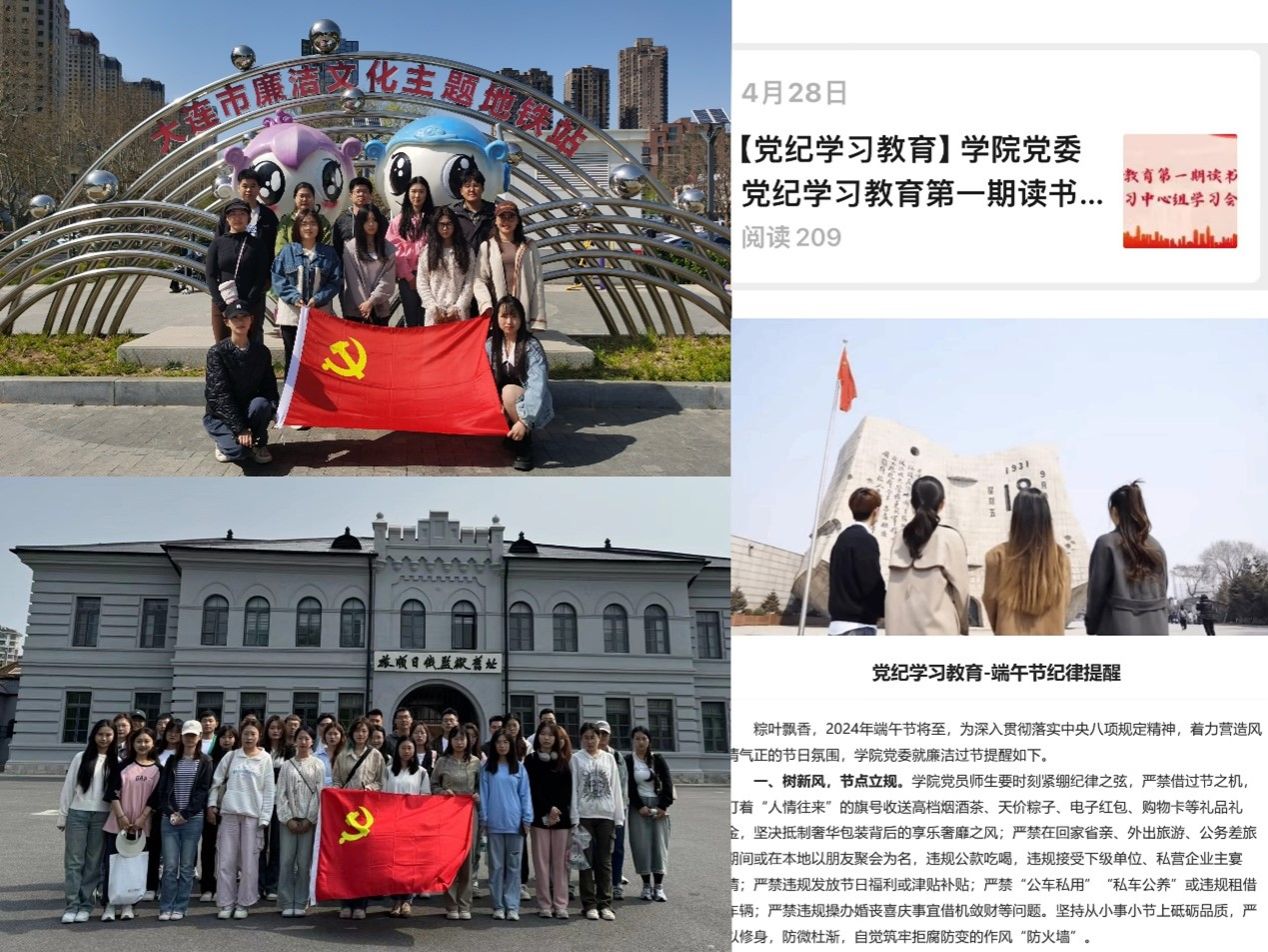 学院党委还开展了党纪学习教育系列活动,引导各支部结合专业特色,开展了形式多样的主题党日活动。学院支部走进大连市廉洁文化主题地铁站、“九·一八”历史博物馆、旅顺日俄监狱旧址博物馆,以及参与模拟法庭审判违纪案例等,让师生在参与中受教育、在体验中长才干。