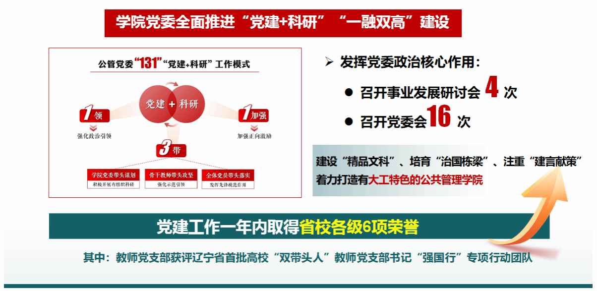 公共管理学院党委结合学院学科特色,认真落实学校第十四次党代会精神,立足“五个坚定不移”和“三个价值导向”,以“党建+科研”为建设目标,致力建设“精品文科”、培育“治国栋梁”、注重“建言献策”,推动学院高质量发展与高水平成果产出,着力打造有大工特色的公共管理学院。